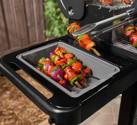 • Includes a 2-sided cutting board with a juice-catching groove that drops into the side table’s centre opening, perfect for easy chopping and carving right at the barbecue or smoker